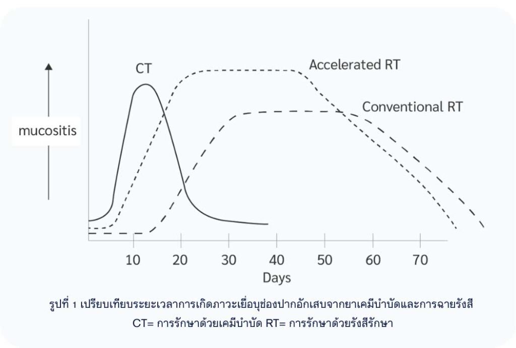 จะเห็นได้ว่าการรับเคมีบำบัดจะทำให้เกิดเยื่อบุช่องปากอักเสบ ได้เร็วกว่ารังสีรักษา