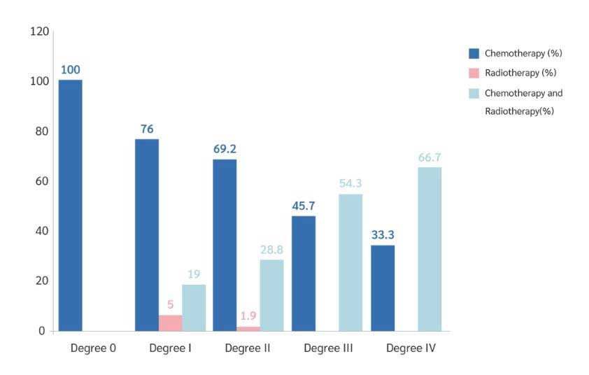 กราฟแสดงร้อยละผู้ป่วยมะเร็งด้วยการรักษาแบบต่างๆ กับระดับความรุนแรง