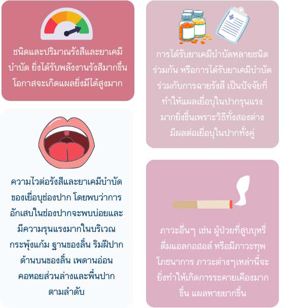 ในช่องปากเมื่อได้รับยาเคมีบำบัด และหรือร่วมกับการฉายแสง เยื่อบุช่องปากอักเสบ มักเกิดอาการมากสุด
